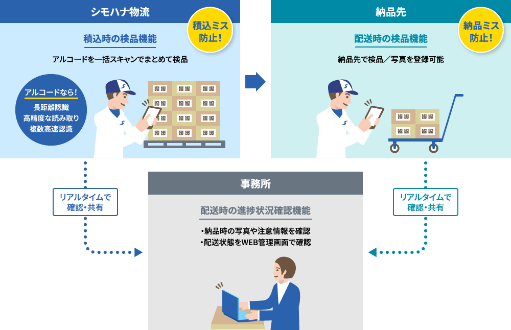 シモハナ物流(株)では、店舗ラベルに「アルコード」を追加し、コース毎の店舗情報を取り込んだスマートフォンで積込前に「アルコード」で検品し積込ミスを抑止、また、納品時に「アルコード」で検品することにより納品ミスを抑止します。