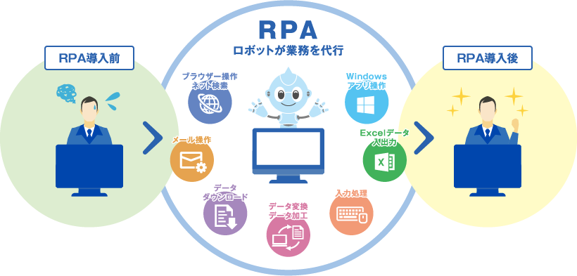 シモハナ物流ではこれまでも、基幹システム・WMS・運行管理システムと連携し、データベース化・Web化することにより様々な業務改善に取り組んでまいりましたが、さらにRPA(Robotics Process Automation)の導入によって、お客様Webシステムや異なるアプリケーションをまたいだ定型業務の自動化が可能となりました。またこれらを組み合わせることで、効率および精度の向上も実現しています。