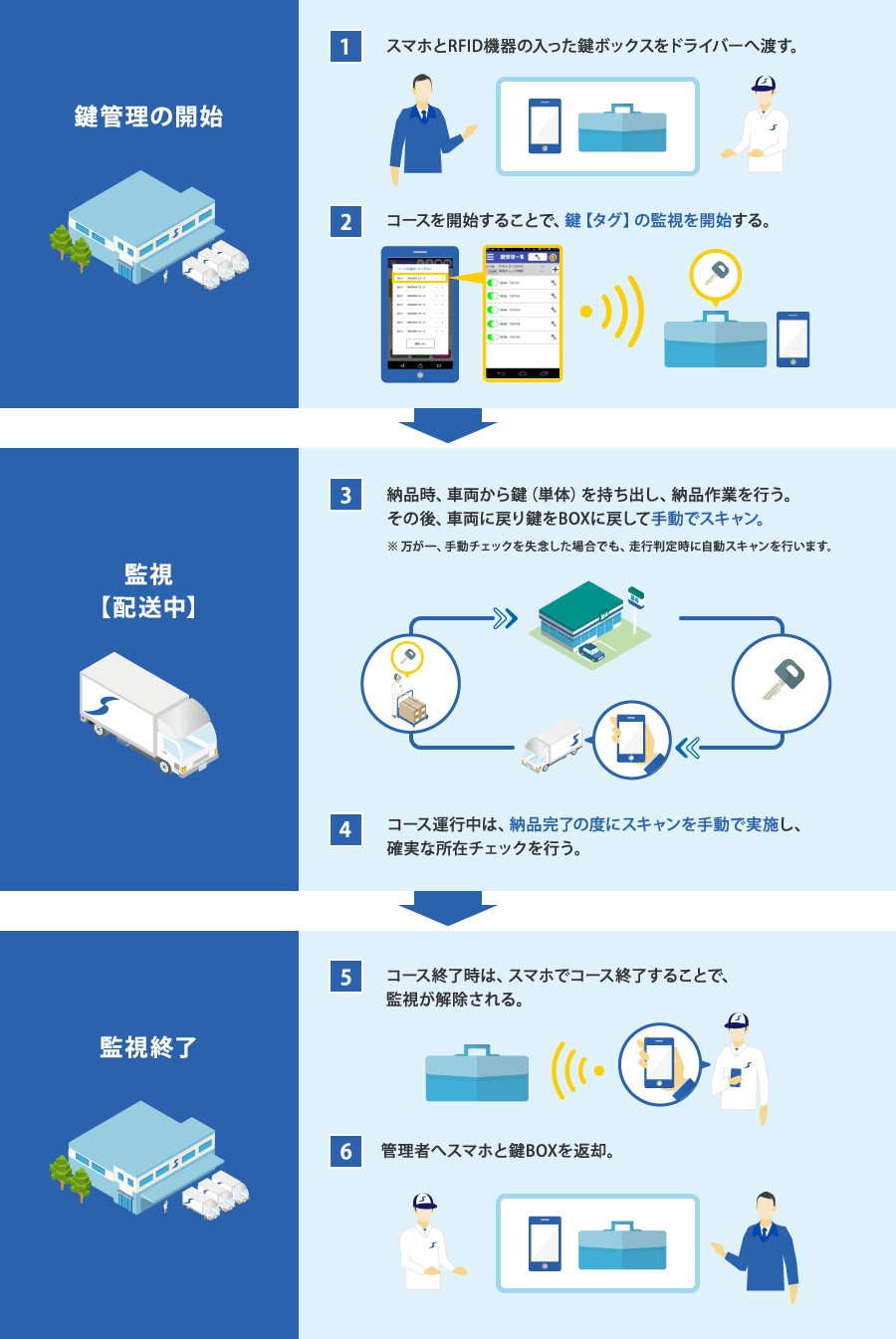 シモハナ物流では「RFID鍵管理システム」を独自開発し、2021年2月より本稼働させました。これは運行管理用のスマホに鍵管理アプリを追加したもので、スマホと連携するRFID機器で、お客様からお預かりした鍵に取り付けたICタグを読み取ることにより、事務所や車両からの持ち出し管理を行ないます。