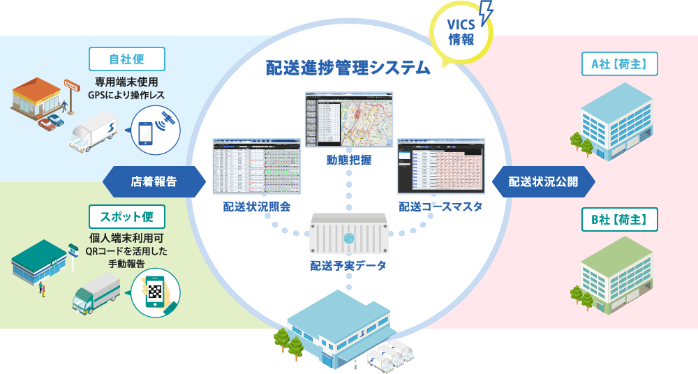 管理者側では、配送中の進捗状況をリアルタイムで確認し、道路交通情報(VICS)から店着時間の予測も可能なため、災害時等の問い合わせ等にも迅速な対応が可能となります。