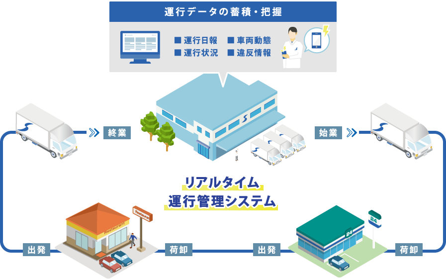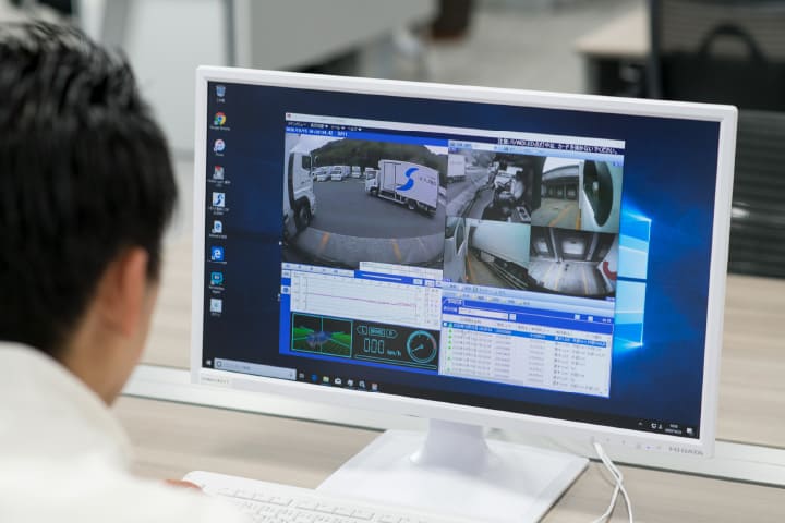 リアルタイム運行管理システムを全トラックに導入。各車両の動態を即時、全社レベルで把握できるようにしています。